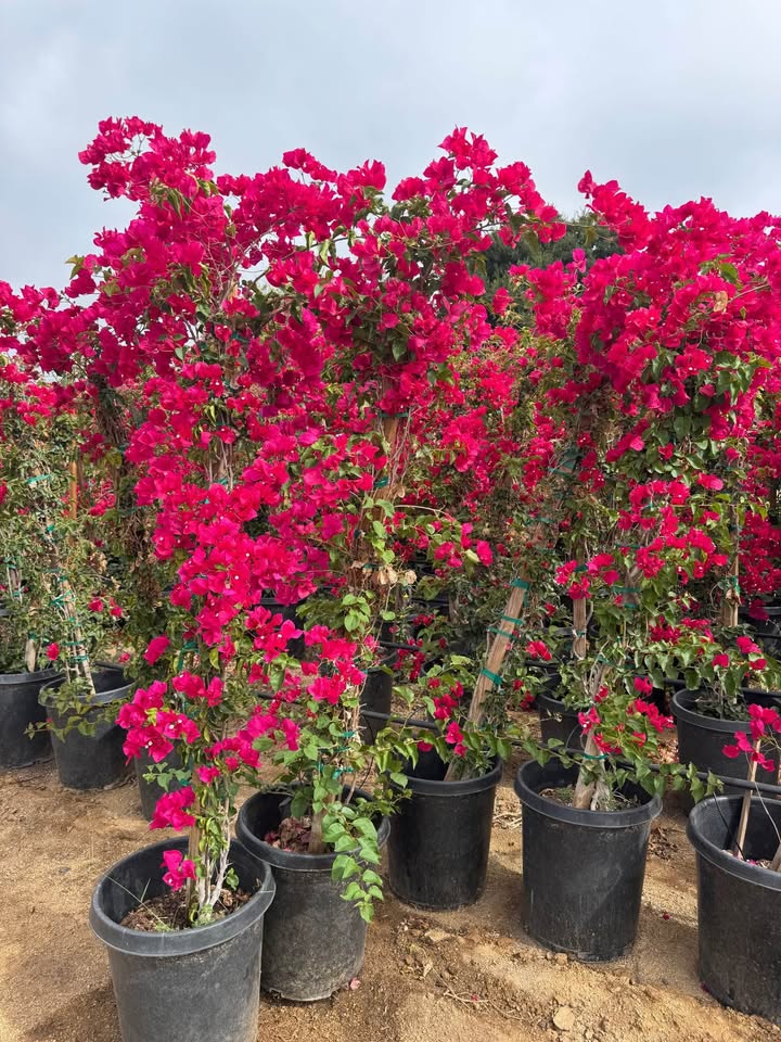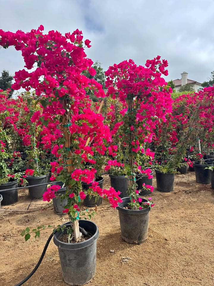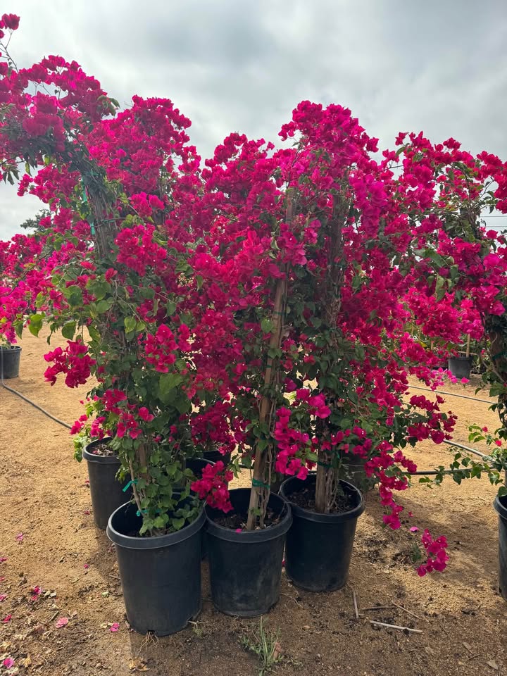 Barbara Karst Bougainvillea is a fast growing woody vine or sprawling shrub distinguished by large, bright magenta-red bracts surrounding tiny white flowers and thorns. Its blooms are showiest from late spring through fall. Leaves are dark green, broadly ovate with slightly wavy margins